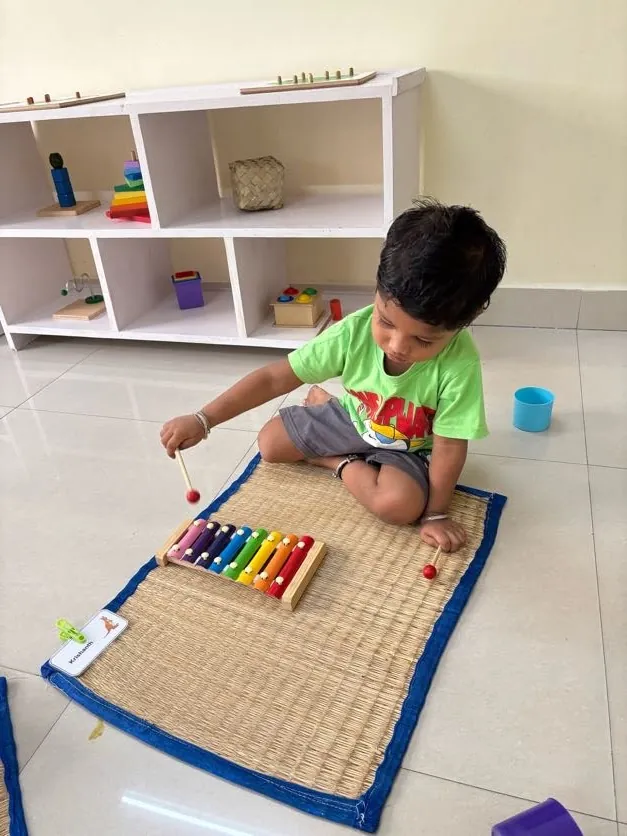 A student engages with Montessori sensorial materials, developing fine motor control and visual discrimination through hands-on exploration.
